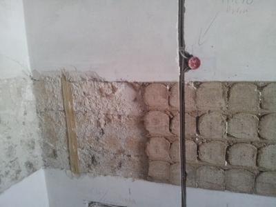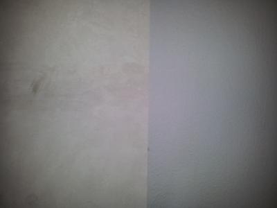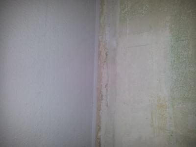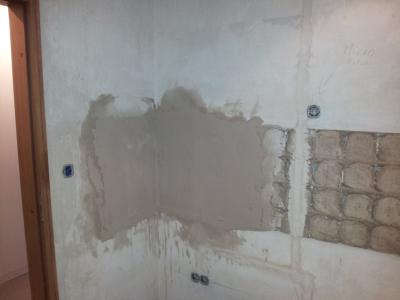 Bisher war nur der alte Fliesenkleber und Fliesenspiegel entfernt. Da der großteil der Wand durch die Küche verdeckt wird, brauchte nur die Ecke, wo wir Kühlschrank und Gefrierschrank als einzelne Geräte aufstellen, besondere Aufmerksamkeit.